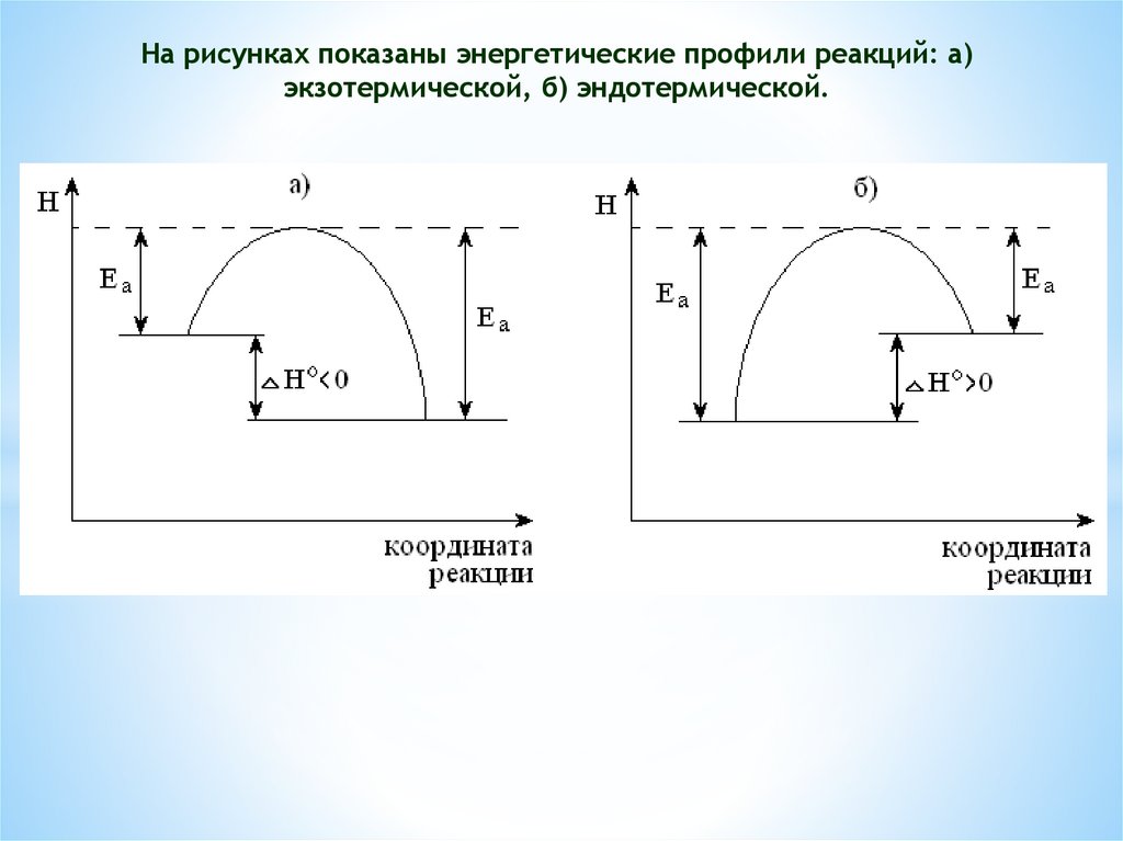 На рисунках показаны энергетические профили реакций: а)экзотермической, б) эндотермической.