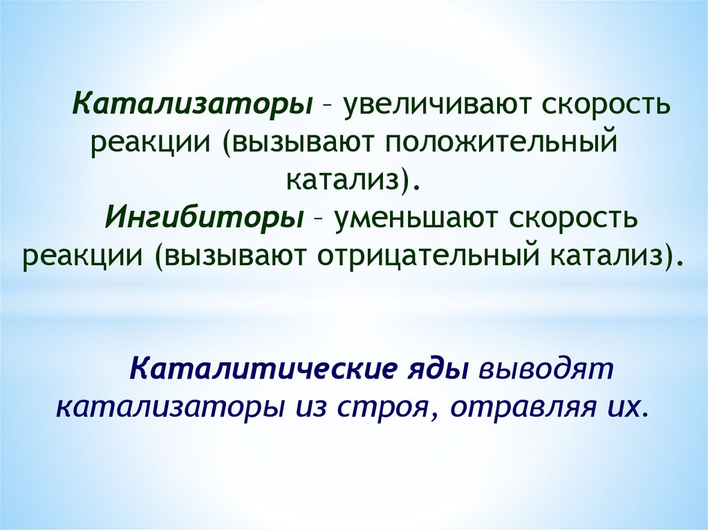 Катализаторы – увеличивают скоростьреакции (вызывают положительный