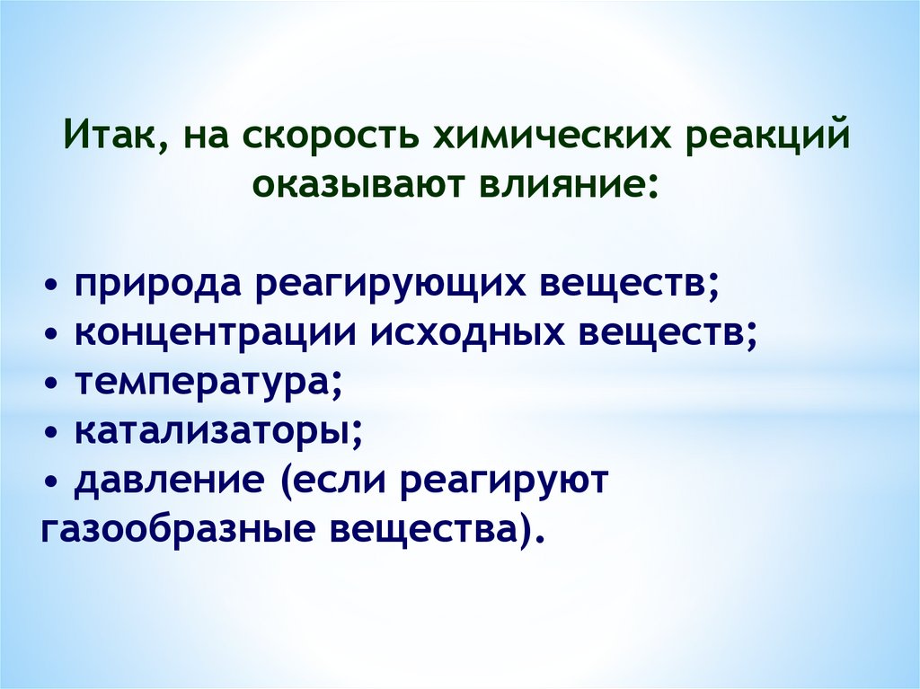 Итак, на скорость химических реакцийоказывают влияние: