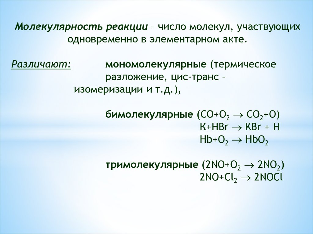 Молекулярность реакции – число молекул, участвующиходновременно в элементарном акте.