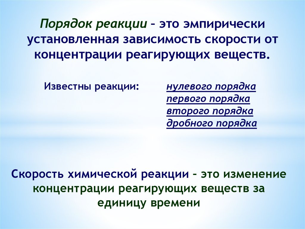 Порядок реакции – это эмпирическиустановленная зависимость скорости от
