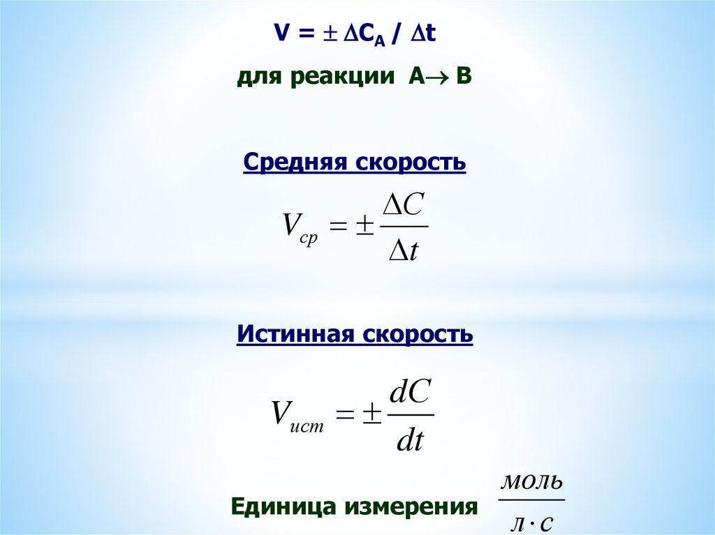 V = CA / tдля реакции А В