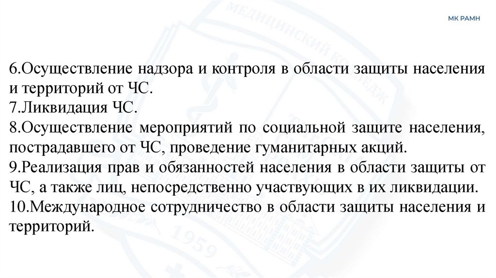 6.Осуществление надзора и контроля в области защиты населенияи территорий от ЧС.