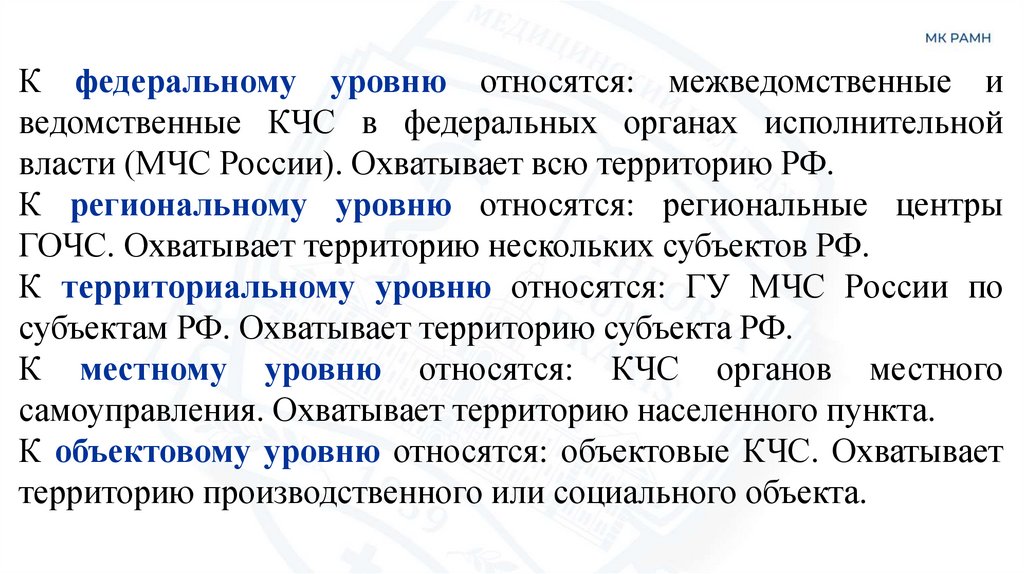 К федеральному уровню относятся: межведомственные иведомственные КЧС в федеральных органах исполнительной