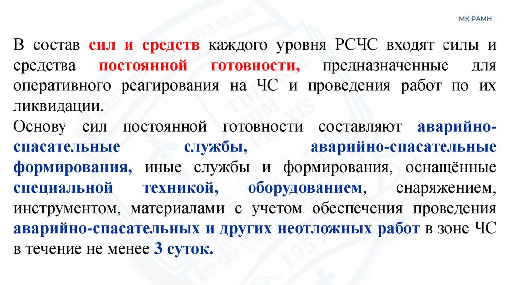 В состав сил и средств каждого уровня РСЧС входят силы исредства постоянной готовности, предназначенные для