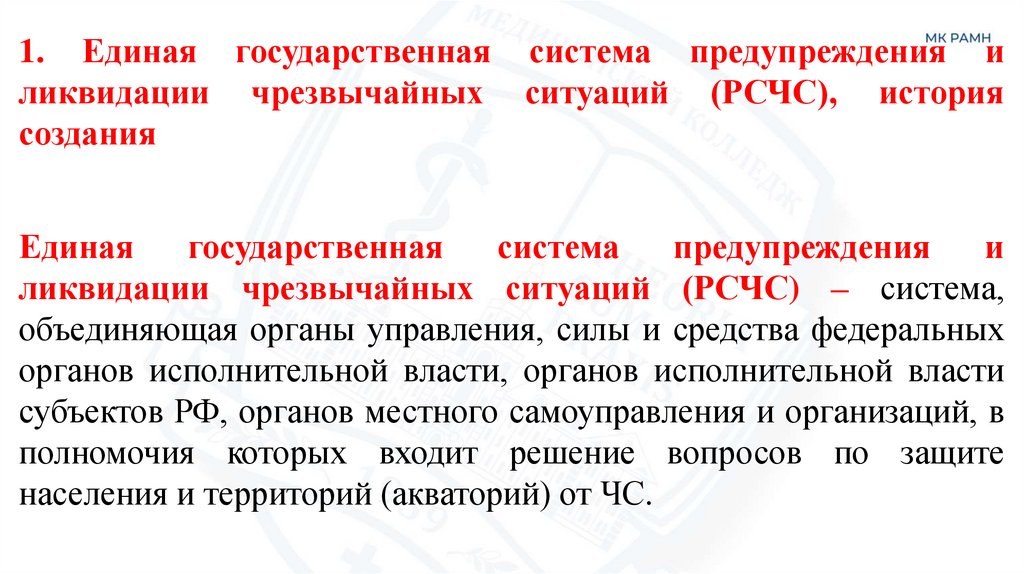 1. Единая государственная система предупреждения иликвидации чрезвычайных ситуаций (РСЧС), история
