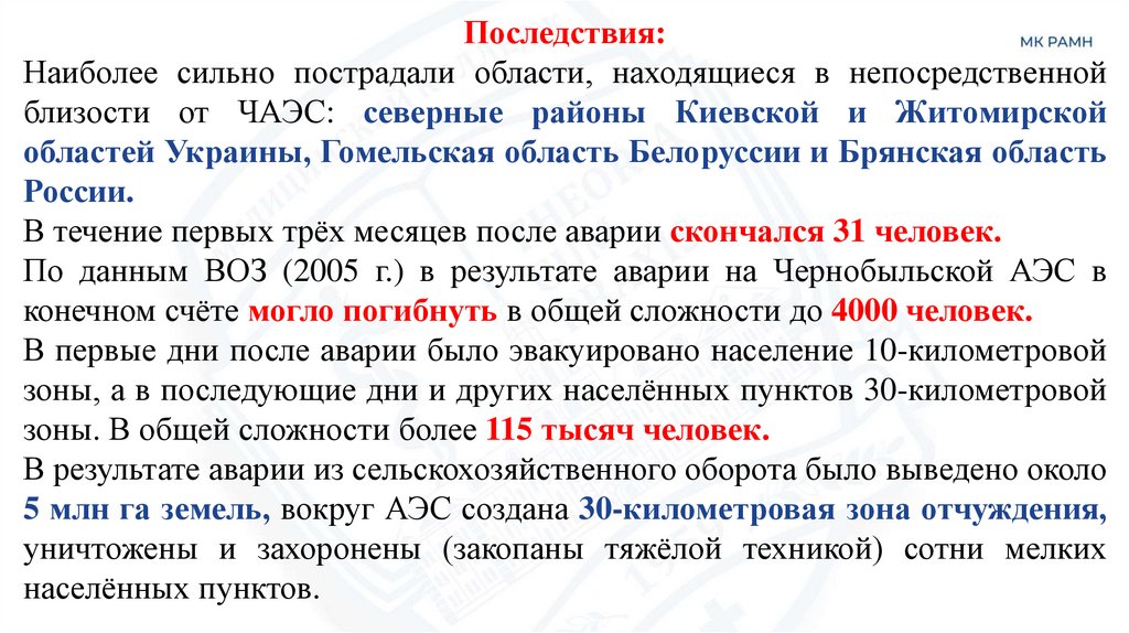 В течение первых трёх месяцев после аварии скончался 31 человек.