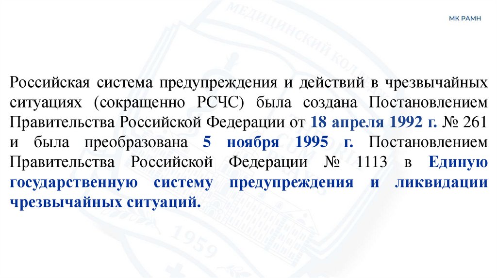 Российская система предупреждения и действий в чрезвычайныхситуациях (сокращенно РСЧС) была создана Постановлением
