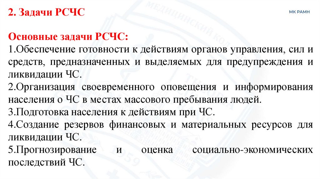 2. Задачи РСЧСОсновные задачи РСЧС: