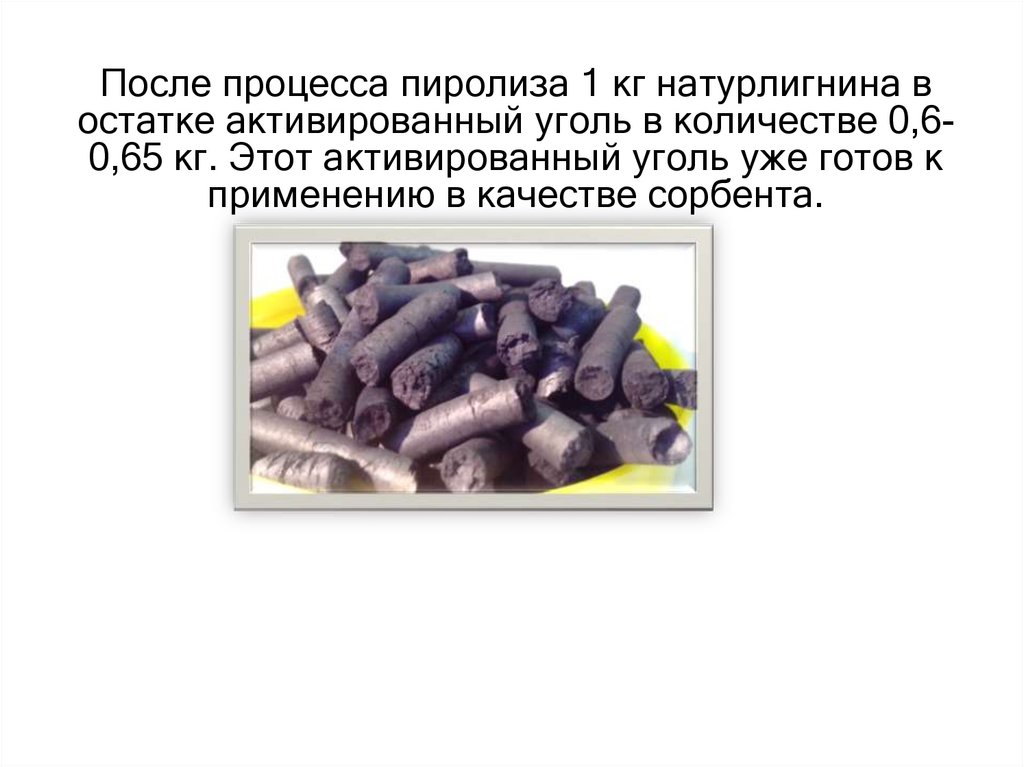 После процесса пиролиза 1 кг натурлигнина востатке активированный уголь в количестве 0,60,65 кг. Этот активированный уголь уже готов к
