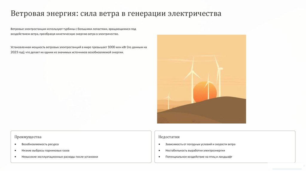 Ветровая энергия: сила ветра в генерации электричестваВетровые электростанции используют турбины с большими лопастями, вращающимися под