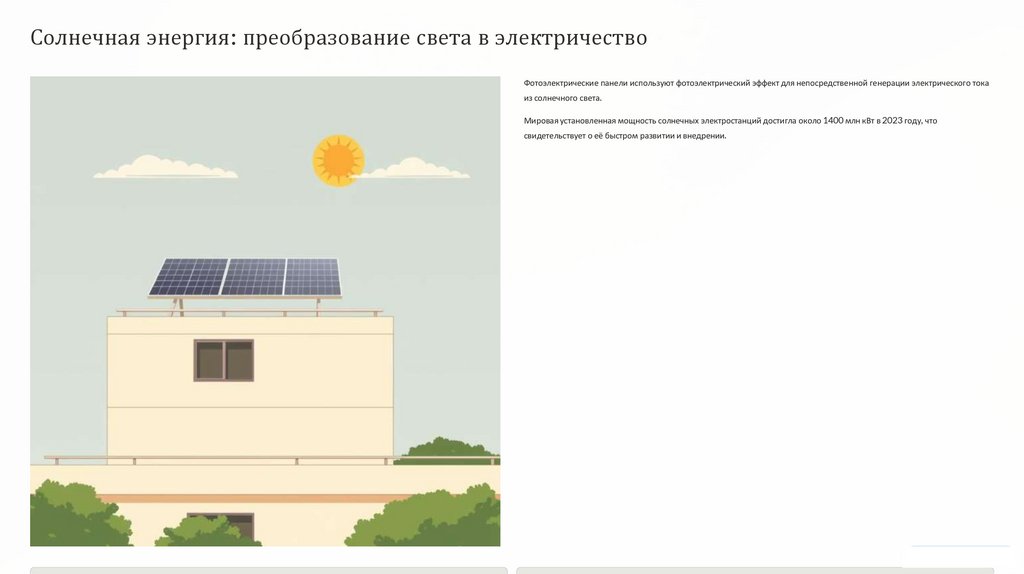 Солнечная энергия: преобразование света в электричествоФотоэлектрические панели используют фотоэлектрический эффект для непосредственной генерации электрического тока