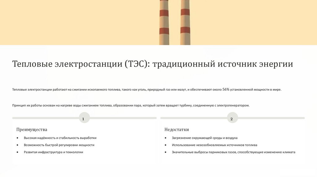 Тепловые электростанции (ТЭС): традиционный источник энергииТепловые электростанции работают на сжигании ископаемого топлива, такого как уголь, природный газ или мазут, и обеспечивают около 56% установленной мощности в мире.