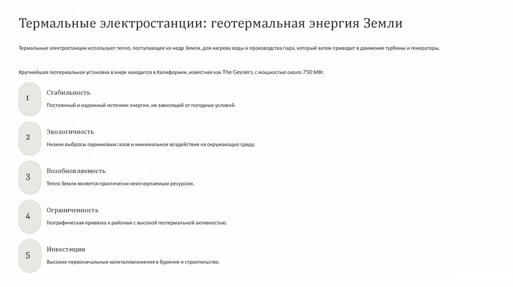 Термальные электростанции: геотермальная энергия ЗемлиТермальные электростанции используют тепло, поступающее из недр Земли, для нагрева воды и производства пара, который затем приводит в движение турбины и генераторы.