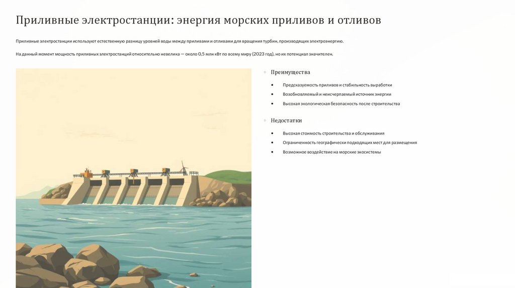Приливные электростанции: энергия морских приливов и отливовПриливные электростанции используют естественную разницу уровней воды между приливами и отливами для вращения турбин, производящих электроэнергию.