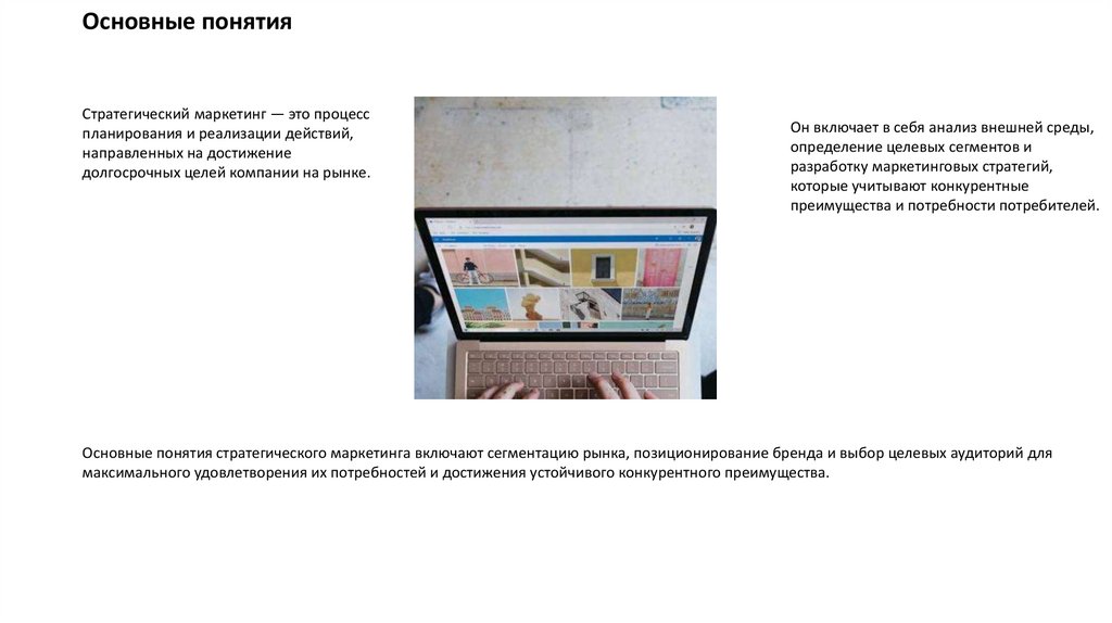 Основные понятия стратегического маркетинга включают сегментацию рынка, позиционирование бренда и выбор целевых аудиторий для