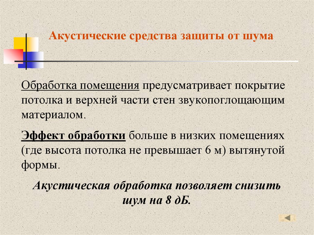 Акустические средства защиты от шумаОбработка помещения предусматривает покрытие