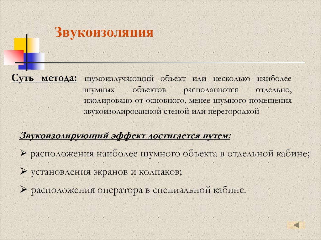 ЗвукоизоляцияСуть метода: шумоизлучающий объект или несколько наиболее