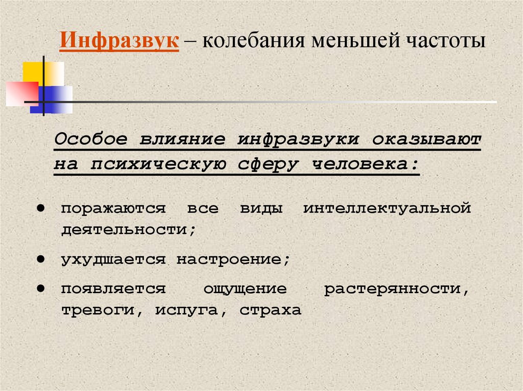 Инфразвук – колебания меньшей частотыОсобое влияние инфразвуки оказывают