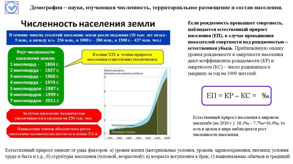 Естественный прирост зависит от ряда факторов: а) уровня жизни (материальные условия, уровень здравоохранения, питания, условия