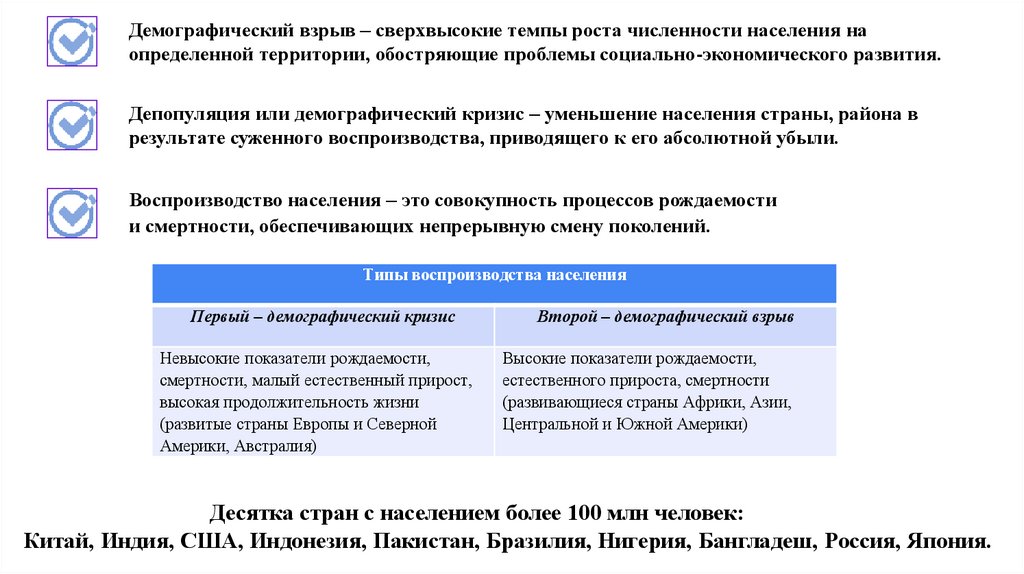 Демографический взрыв – сверхвысокие темпы роста численности населения наопределенной территории, обостряющие проблемы социально-экономического развития.