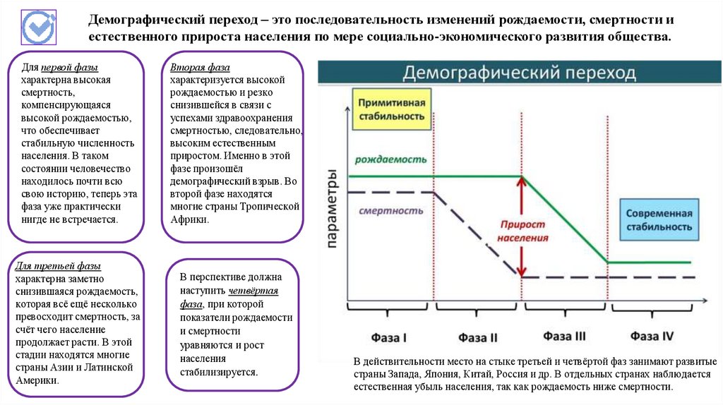 Демографический переход – это последовательность изменений рождаемости, смертности иестественного прироста населения по мере социально-экономического развития общества.