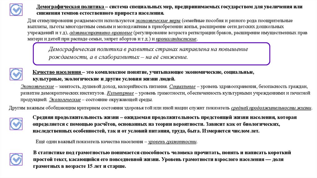 Качество населения – это комплексное понятие, учитывающее экономические, социальные,