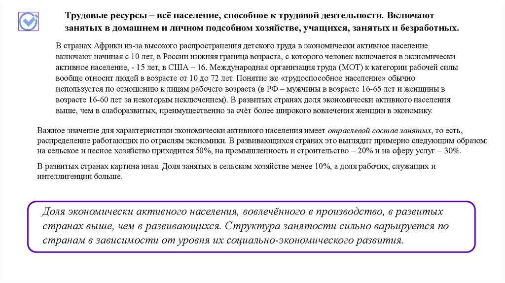 возрасте 16-60 лет за некоторым исключением). В развитых странах доля экономически активного населения