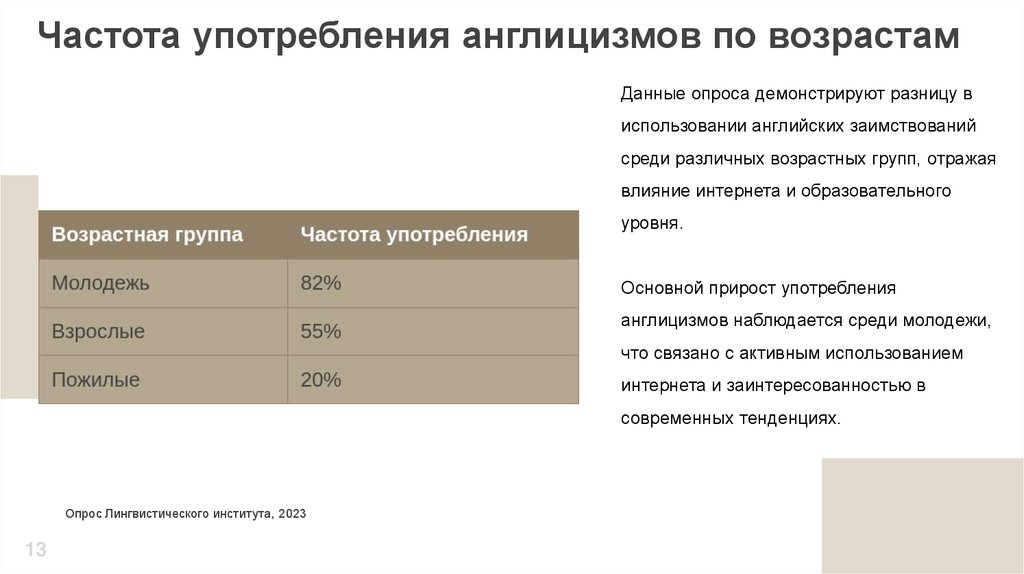 Частота употребления англицизмов по возрастамДанные опроса демонстрируют разницу в