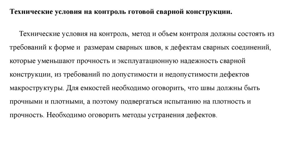 Технические условия на контроль готовой сварной конструкции.Технические условия на контроль, метод и объем контроля должны состоять из