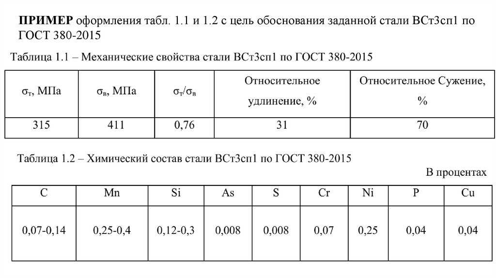 ПРИМЕР оформления табл. 1.1 и 1.2 с цель обоснования заданной стали ВСт3сп1 поГОСТ 380-2015