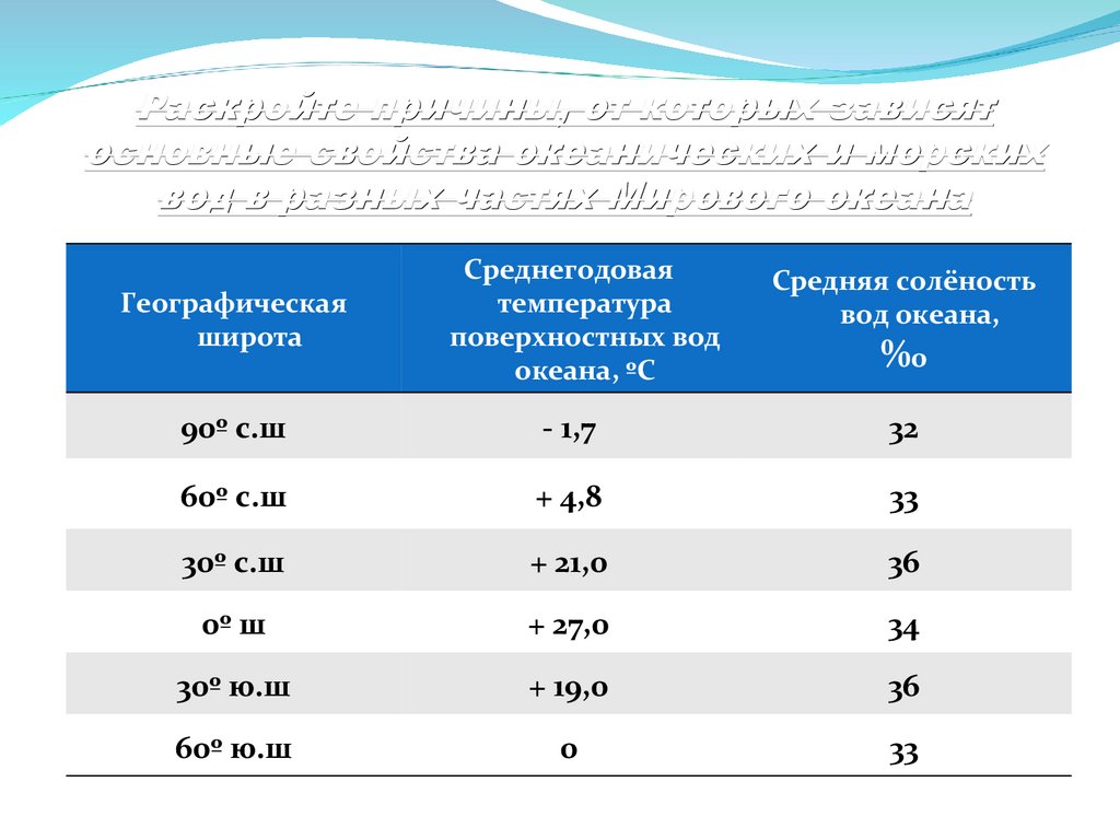 Раскройте причины, от которых зависятосновные свойства океанических и морских