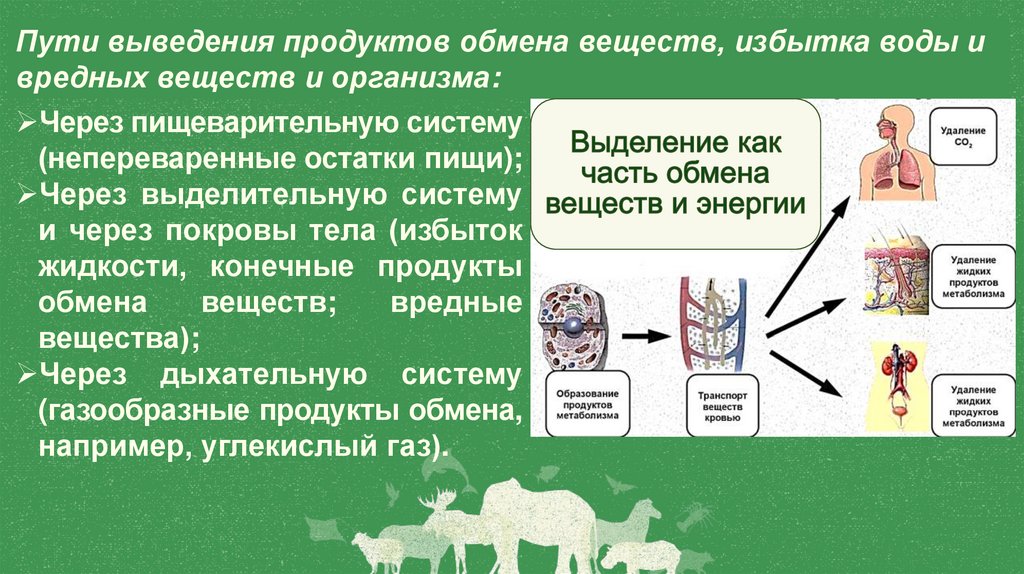 Пути выведения продуктов обмена веществ, избытка воды ивредных веществ и организма: