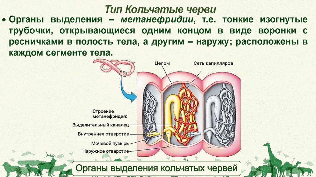 Тип Кольчатые червиОрганы выделения – метанефридии, т.е. тонкие изогнутые