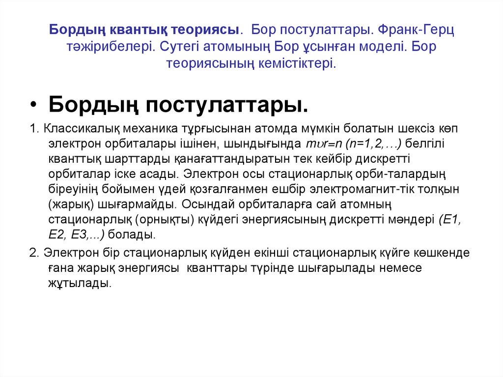 1. Бордың квантық теориясы. Бор постулаттары. Франк-Герц тәжірибелері. Сутегі атомының Бор ұсынған моделі. Бор теориясының