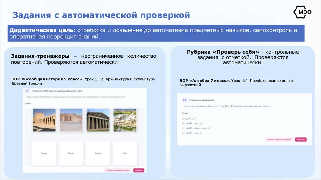 Задания с автоматической проверкойДидактическая цель: отработка и доведение до автоматизма предметных навыков, самоконтроль и