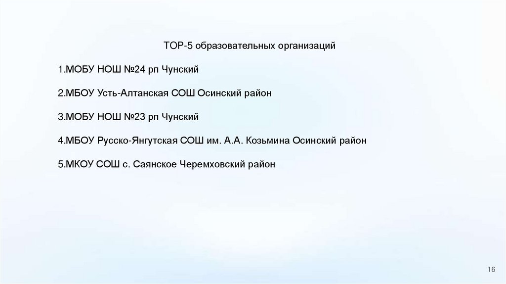 TOP-5 образовательных организаций1.МОБУ НОШ №24 рп Чунский