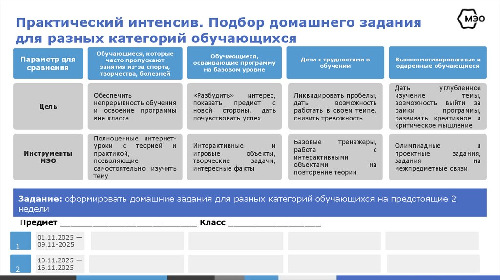 Задание: сформировать домашние задания для разных категорий обучающихся на предстоящие 2