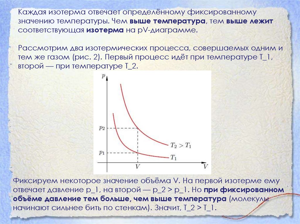 • Чем больше давление, тем ниже идёт изобара на VTдиаграмме.• Рассмотрим две изобары с давлениями p_1 и p_2