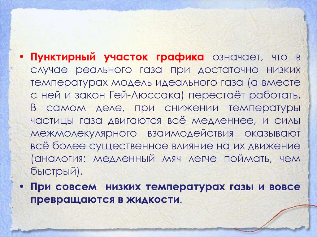 • Пунктирный участок графика означает, что вслучае реального газа при достаточно низких