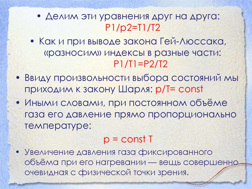 • Делим эти уравнения друг на друга:P1/p2=T1/T2