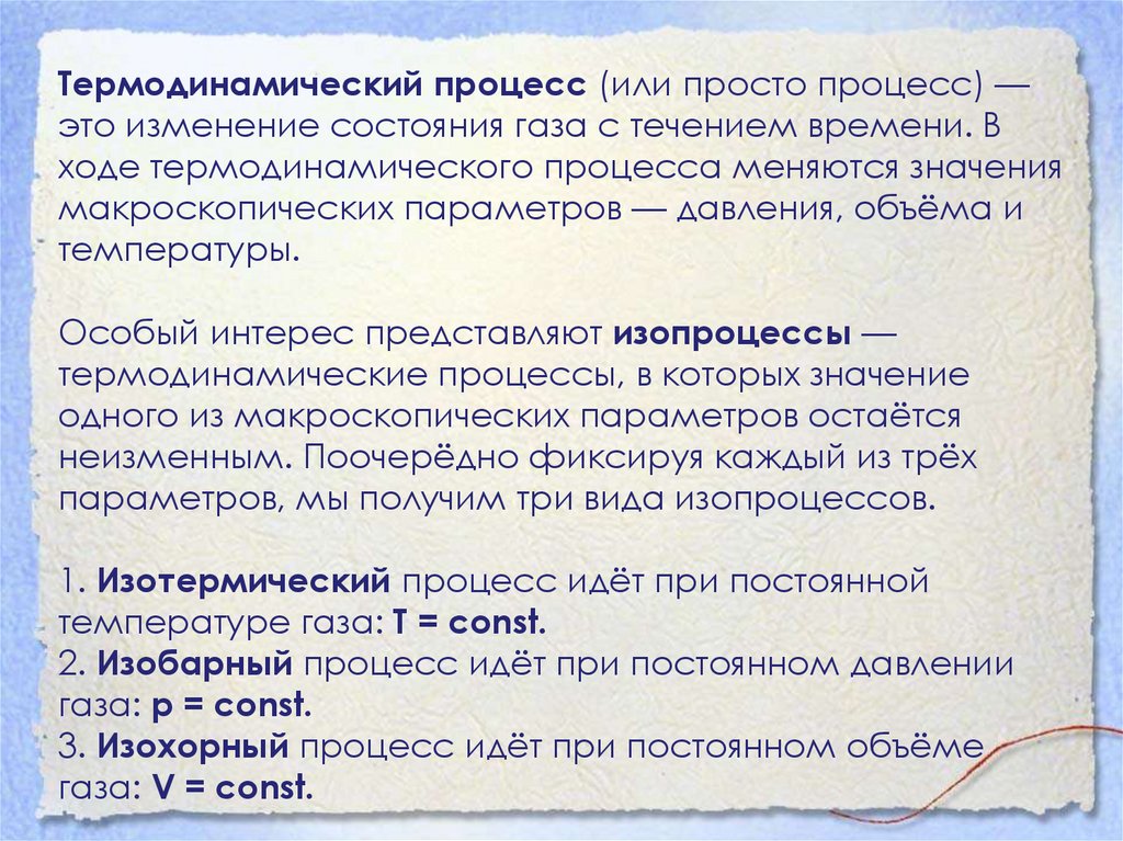 Термодинамический процесс (или просто процесс) —это изменение состояния газа с течением времени. В