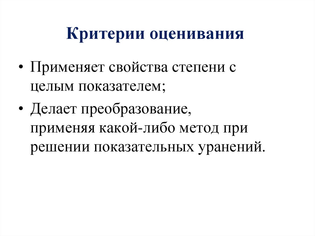Критерии оценивания• Применяет свойства степени с