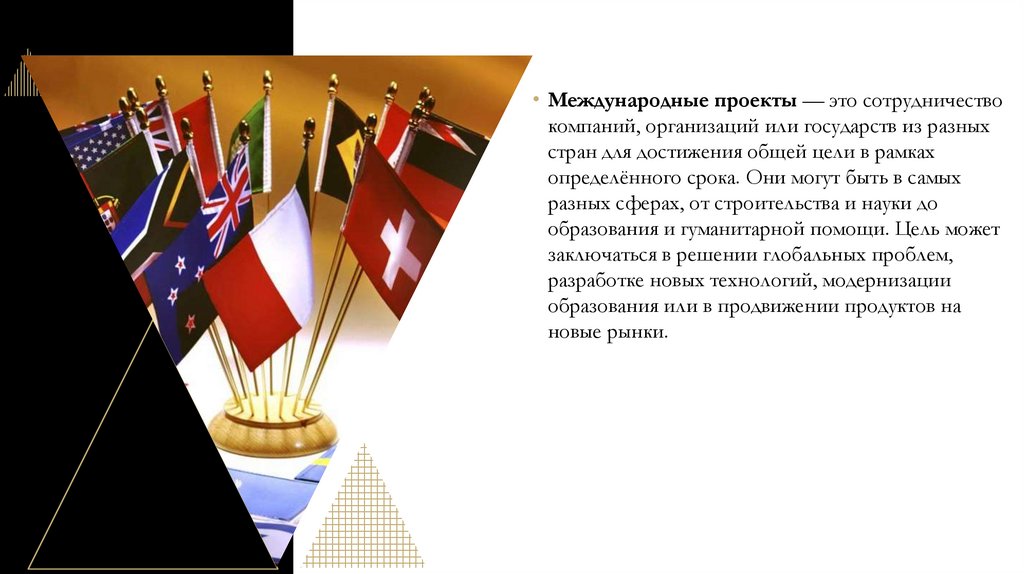 • Международные проекты — это сотрудничествокомпаний, организаций или государств из разных