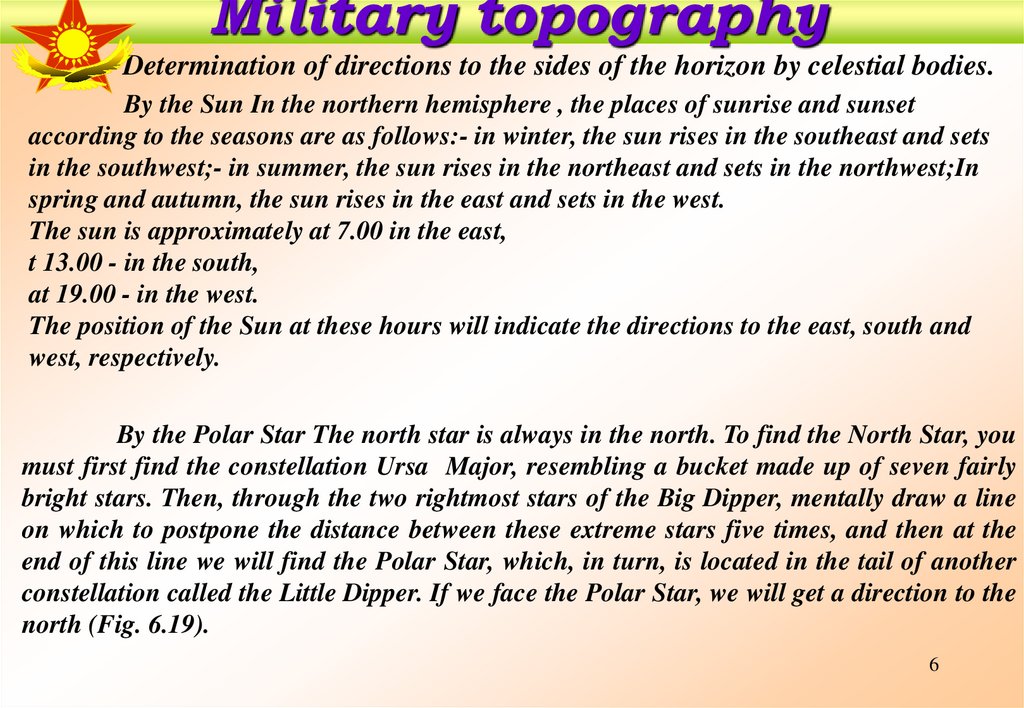 Military topographyDetermination of directions to the sides of the horizon by celestial bodies.