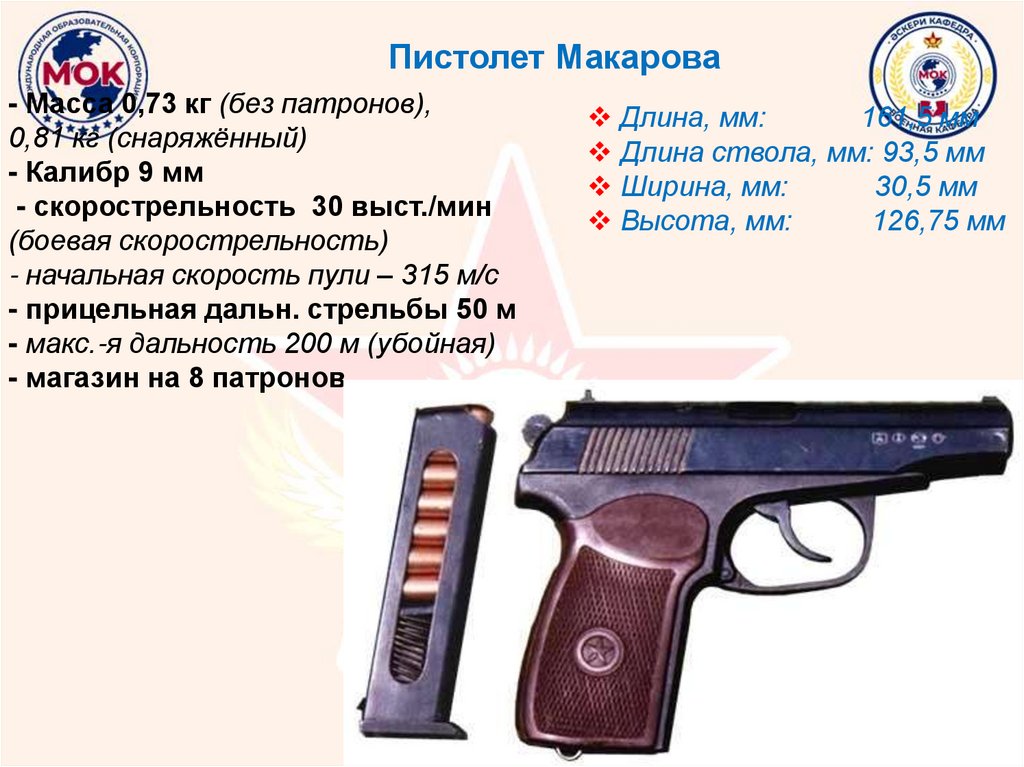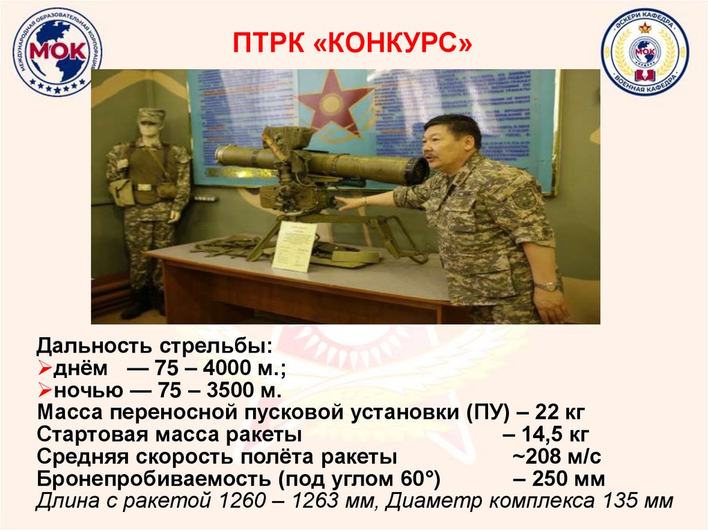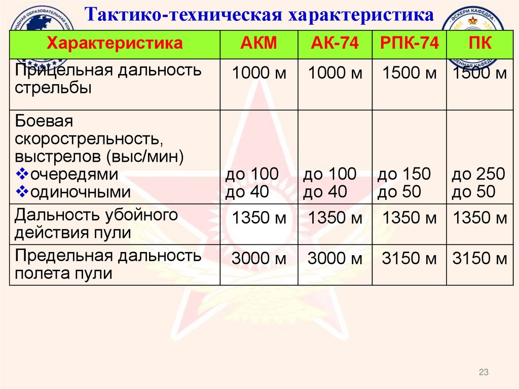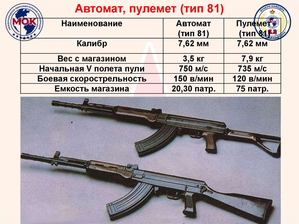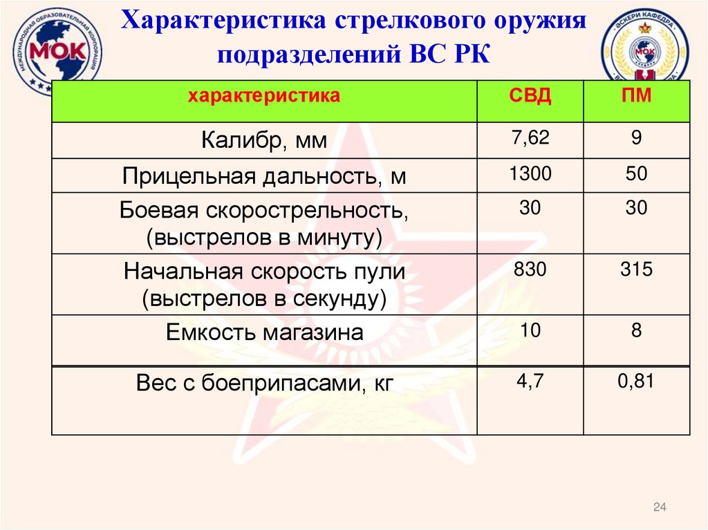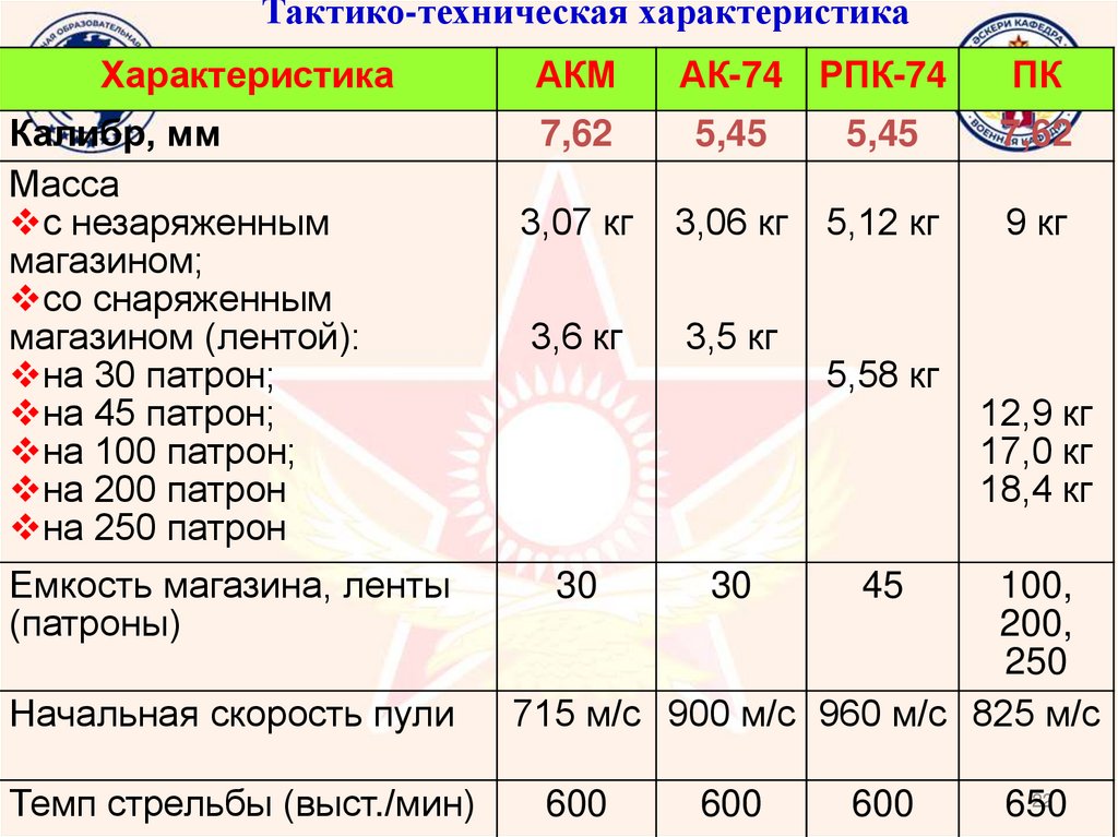 - ПМ-1, ПК-1, СВД-1, РПГ-7в -3, РПК-74 -3, АКС-74У -6, АК 74- 15, ГП-25 -6.