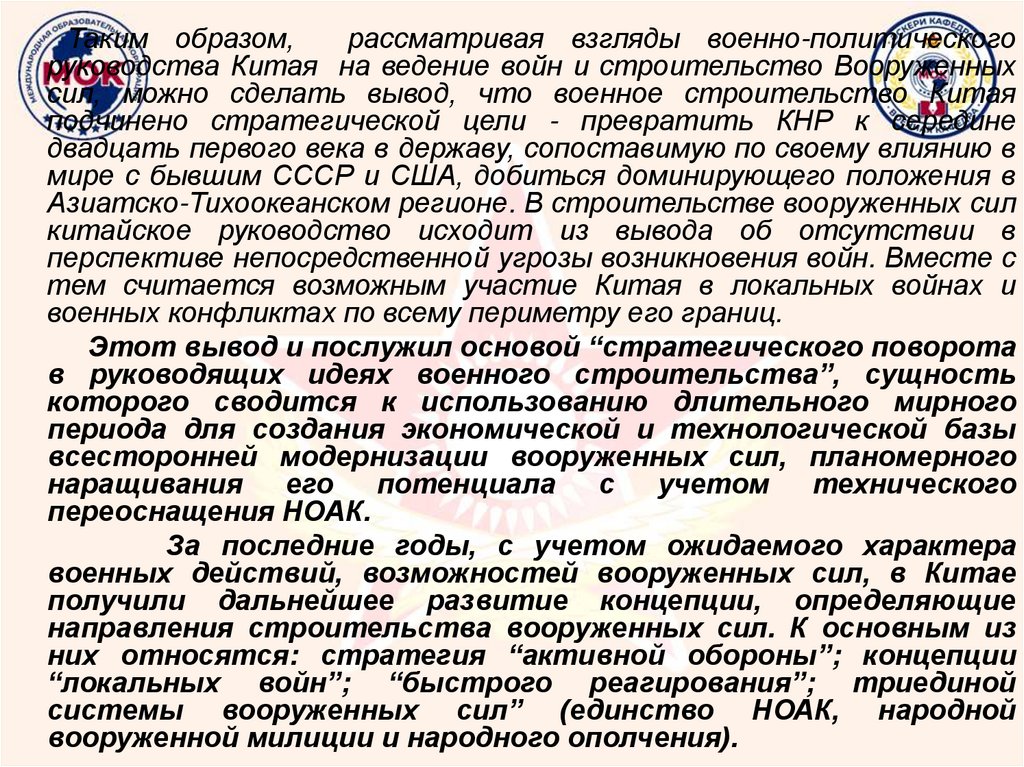 Таким образом, рассматривая взгляды военно-политического руководстваКитая на ведение войн и строительство Вооруженных сил, можно сделать
