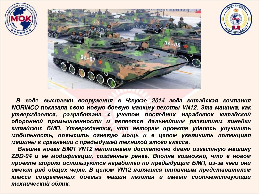 В ходе выставки вооружения в Чжухае 2014 года китайская компанияNORINCO показала свою новую боевую машину пехоты VN12. Эта машина, как