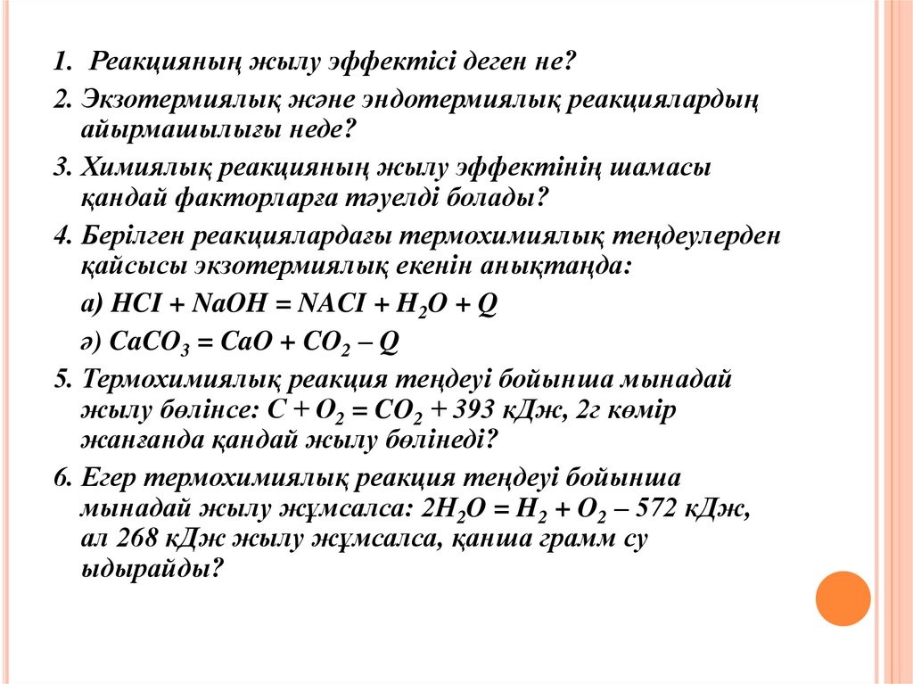 1. Реакцияның жылу эффектісі деген не?2. Экзотермиялық және эндотермиялық реакциялардың