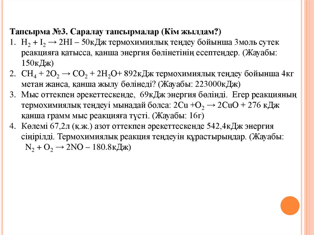 Тапсырма №3. Саралау тапсырмалар (Кім жылдам?)1. Н2 + I2 → 2HI – 50кДж термохимиялық теңдеу бойынша 3моль сутек